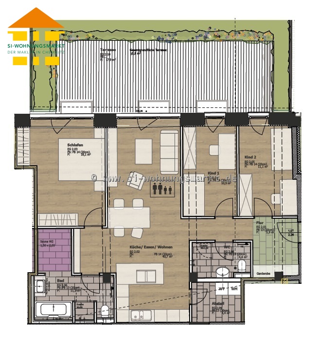 Hierbei handelt es sich um eine barrierefreie, geräumige 4-Raum-Wohnung im Erdgeschoss. Die Einheit beeindruckt nicht nur durch die Süd-West-Terrasse (ca. 35m²) mit Steinbelag sondern auch durch das hochwertig ausgestattete Badezimmer mit Sauna. Großflächige Fensterfronten lassen viel Licht herein und ermöglichen dem Mieter einen schönen Blick auf die eigene Terrasse. Weitere bemerkenswerte Ausstattungsdetails sind die Einbauküche, die Fußbodenheizung, das Massivholzparkett in allen Wohnbereichen, das Gäste-WC mit zusätzlicher Dusche, der separate Abstellraum mit Waschmaschinenanschluss sowie die elektrisch regulierbaren Senkrechtmarkisen, welche ein angenehmes Raumklima schaffen. Ein abgeschlossenes Kellerabteil sowie ein Garagenstellplatz sind dieser Wohneinheit zugeordnet.